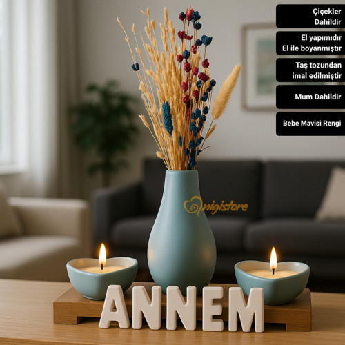 - 5 parçadan oluşan set, çiçekli vazo, kalp mumluk ve ahşap stand gibi farklı unsurları bir araya getirerek estetik bir bütünlük sunar.