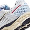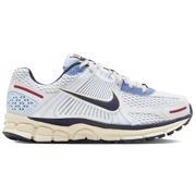 Nike Zoom Vomero 5'in bu versiyonu, esneklik ve havalandırma sağlayan beyaz file üst kısma sahiptir. Kırmızı detaylara sahip beyaz kaplamalar burun kısmını şekillendirirken, mavi kaplamalar bağcıkların altından geçer ve beyaz bir kaplama topuk çevresinde bir kayış oluşturur. Ayakkabının orta kısmı, daha fazla denge için beyaz bir TPU kafes ile desteklenmiştir. Bu TPU'nun her iki tarafında da siyah renkte Swoosh logosu bulunur. Topuk kayışı da küçük bir Swoosh logosuyla süslenmiştir ve topuk, çapraz desenli açık mavi bir TPU kafesten yapılmıştır. Nike Vomero 5'in kimliği dil kısmında kırmızıdır ve siyah-beyaz dış taban genel görünümü tamamlar.