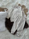 Desenli penye kumaşı, çıtçıtlı body tasarımı ve sade eşofman altıyla 6 ay – 3 yaş arası bebekler için hem konforlu hem zarif iki parçalı takım!