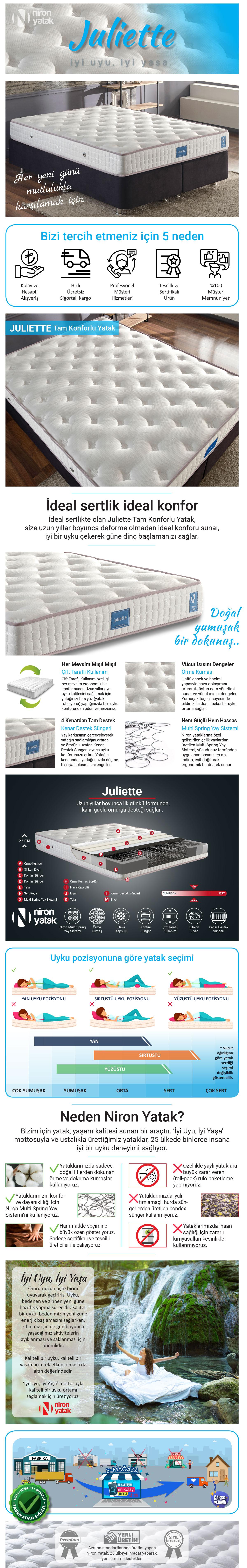Gücünü Niron Multi Spring Yay Sistemi’nden alan Juliette Yatak, size uzun yıllar boyunca deforme olmadan ideal konforu sunar, vücudunuz için ideal sertliğe sahip konfor süngerleri sayesinde iyi bir uyku çekerek güne dinç başlamanızı sağlar.