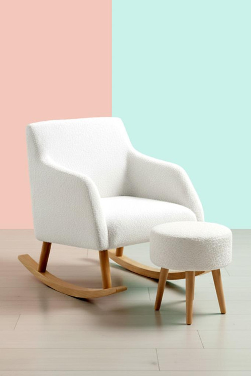 Niron LOOP Sallanan Sandalye ve Puf Seti – Ekru Teddy Kumaş Ahşap Ayaklı Berjer - Sallanan Koltuk Puf