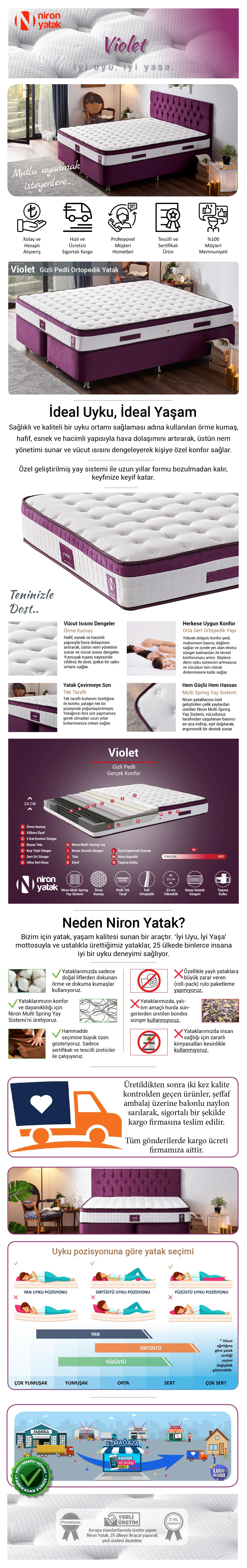 Gücünü Niron Multi Spring Yay Sistemi’nden alan Violet Yatak, size uzun yıllar boyunca deforme olmadan ideal konforu sunar, vücudunuz için ideal sertliğe sahip konfor süngerleri sayesinde iyi bir uyku çekerek güne dinç başlamanızı sağlar.
