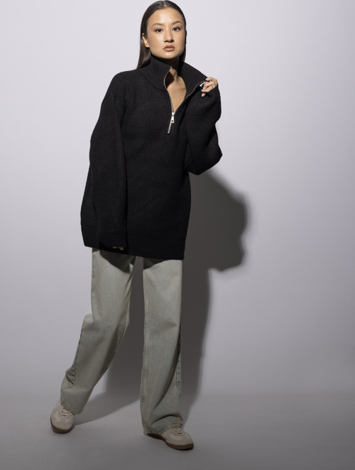 Bu kadın fermuarlı kazak modelini; yüksek bel jean pantolonlar ve deri botlarla kombinleyerek günlük stilinizi tamamlayabilir ya da taytlar ile kullanarak hafta sonu konforunu yakalayabilirsiniz.