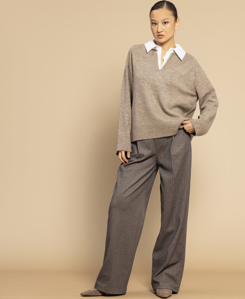 Bu gömlek detaylı kazak modelini, görseldeki gibi yüksek bel kumaş pantolonlar ve sivri burun botlarla eşleştirerek "smart-casual" bir ofis stili oluşturabilirsiniz. Daha günlük bir görünüm için jean pantolonlar ve deri loafer ayakkabılarla kombinleyerek kolej stilini modern bir şekilde yorumlayın.