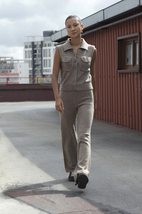 Bu kadın triko pantolon modelini; görseldeki gibi aynı dokuya sahip bir yelek veya hırka ile kombinleyerek monokrom bir şıklık yakalayabilir, sneaker veya loafer ayakkabılarla günlük tarzınızı tamamlayabilirsiniz.