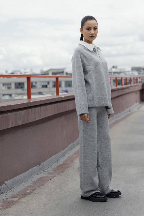 Bu kadın triko pantolon modelini; görseldeki gibi aynı dokuya sahip bir yelek veya hırka ile kombinleyerek monokrom bir şıklık yakalayabilir, sneaker veya loafer ayakkabılarla günlük tarzınızı tamamlayabilirsiniz.