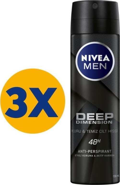 NİVEA Men Deep Dimension Sprey Deodorant aktif karbon içeren formülüyle terlemeye ve ter kokusuna karşı güçlü koruma sağlar. Uzun süreli kuru ve temiz bir cilt hissi sağlar. Siyah karbon içeren formülü sayesinde terlemeye ve ter kokusuna karşı etkili. Gözle görülür siyah iz bırakmaz. 48 saate kadar etkili anti-perspirant koruması sağlar. Ciltle uyumu dermatolojik olarak kanıtlanmıştır.