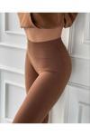 Klasik stilin zarafetini yansıtan bu kadın kahverengi toparlayıcı yüksek bel fitilli tayt, günlük kullanımda şıklığınızı korumanızı sağlar.