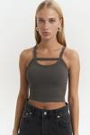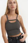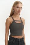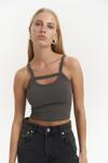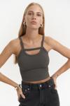 Derin yuvarlak ve şerit yakalı, tek sıra ince omuz askılı, göğüs kaplı, fitil kumaşlı askılı crop top.