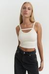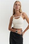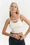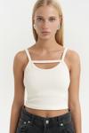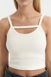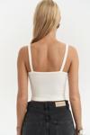 Derin yuvarlak ve şerit yakalı, tek sıra ince omuz askılı, göğüs kaplı, fitil kumaşlı askılı crop top.