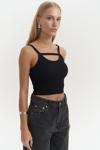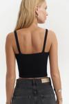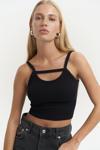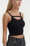 Derin yuvarlak ve şerit yakalı, tek sıra ince omuz askılı, göğüs kaplı, fitil kumaşlı askılı crop top.