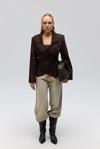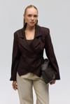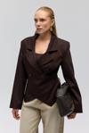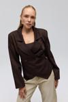 Ön kısımda çapraz asimetrik kesim detaylı tasarım blazer ceket. Belden oturtmalı, omuzları vatkalı, uzun kollu, manşetleri düğmeli, yalancı cep görünümlü. Kruvaze düğme kapamlı. Astarlı özel tasarım.