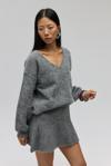 Bel kısmı oturan, etek ucu volanlı, beli lastikli ve örgülü formda mini triko etek.