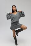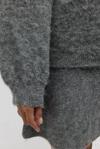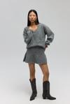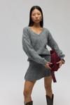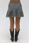 Bel kısmı oturan, etek ucu volanlı, beli lastikli ve örgülü formda mini triko etek.