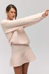 Bel kısmı oturan, etek ucu volanlı, beli lastikli ve örgülü formda mini triko etek.