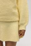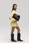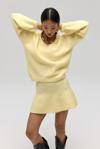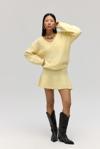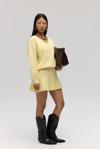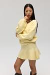 Bel kısmı oturan, etek ucu volanlı, beli lastikli ve örgülü formda mini triko etek.