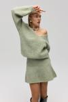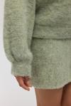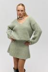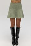 Bel kısmı oturan, etek ucu volanlı, beli lastikli ve örgülü formda mini triko etek.