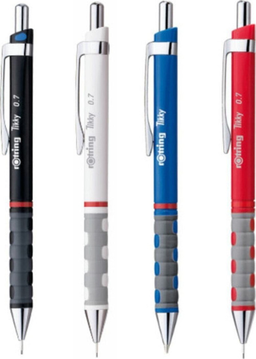 Set içeriği Rotring tikky kahverengi, siyah, mavi ve kırmzı renkte kalemler.
