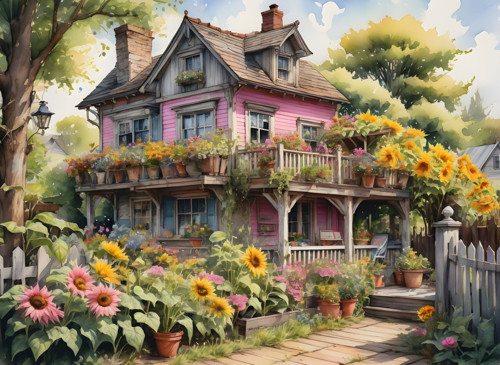 Ayçiçekli Pembe Ahşap Ev 1000 Parça Puzzle;