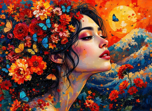 Görselde, profilinden görülen genç ve zarif bir kadın figürü yer alıyor. Kadının uzun, dalgalı siyah saçları adeta bir bahçeye dönüşmüş; kırmızı, turuncu ve sarı tonlarında büyük çiçekler, kelebekler ve yapraklarla iç içe geçmiş. Saçındaki bu floral patlama, doğanın kendisiyle bütünleşmiş bir güzelliği yansıtıyor.