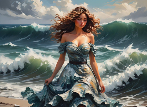 Dalgalı, fırtınalı bir okyanusun ortasında, rüzgârda uçuşan dalgalı saçlarıyla genç ve etkileyici bir kadın duruyor. Üzerinde, denizin köpükleri ve dalgaların tonlarını taşıyan, adeta sıvı gibi akışkan bir gece mavisi elbise var; kumaş, dalgalarla bütünleşmişçesine hareket ediyor ve kadrajın her yerinde suyun enerjisini hissettiriyor. Elbisenin omuzları açık, beli ince bir kemerle vurgulanmış, etekleri ise rüzgâr ve dalgalarla dans edercesine kıvrılıyor.