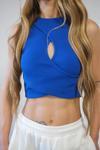 Crop siluetiyle modern ve trend bir görünüm kazandırırken, halter yaka tasarımı omuzları zarifçe sergiler.