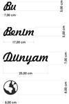 Teknik Özellikler: - Malzeme: MDF - Üretim Yöntemi: Lazer Kesim - Renk: Doğal Siyah - Boyutlar: Bu:5x7 cm Benim:17x5 cm Dünyam:25x7 cm Dünya:8x8 cm Bu özel duvar dekoruyla mekanınızı kişiselleştirin ve "Bu Benim Dünyam" deyin!