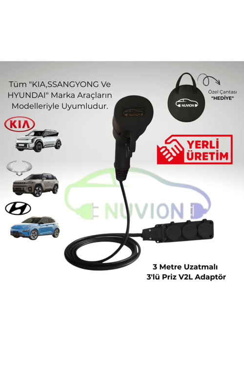 ⚡️ Tüm KIA, HYUNDAI, SSANYONG Modelleriyle Uyumlu: 3 Metre Uzatmalı 3'lü Priz V2L Adaptör (Lüks HEDİYE Çantalı) 🔋 Elektriği Aracınızdan Alın, Hayatınızı Kolaylaştırın! NUVION V2L Adaptör ile elektrikli KIA, HYUNDAI, SSANYONG aracınızın yüksek kapasiteli bataryasını güçlü bir enerji kaynağına dönüştürün! Kamp alanında, piknikte, acil durumlarda veya herhangi bir dış mekânda elektrik ihtiyacınız olduğunda, aracınızdaki enerjiyi güvenle kullanın.
