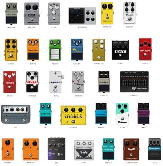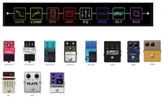 - GATE, COMP, EFX, AMP, EQ, MOD, DLY, RVB efekt blokları, serbest sıralama imkanıyla.