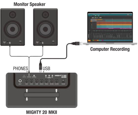 | Çok Yönlü USB Yönlendirme Seçenekleri MIGHTY 20 MKII hoparlörünü kullanarak sessiz pratik yapmak için kulaklık taktığınızda, hoparlörün otomatik olarak kendini susturduğunu unutmamak önemlidir. Sisteminizi doğru bir şekilde kurmak için adım adım rehber: