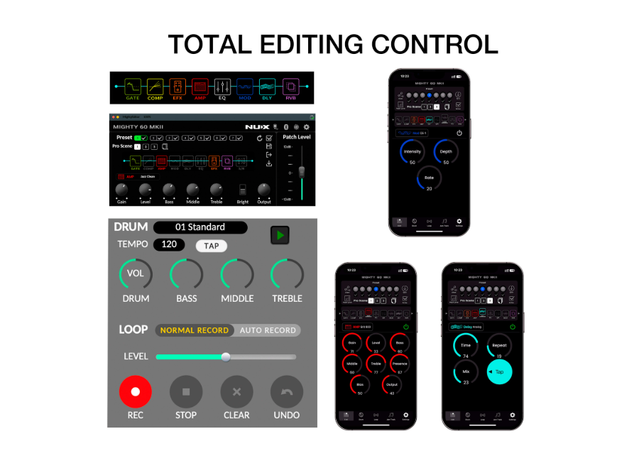 | GATE, COMP, EFX, AMP EQ, MOD, DLY, RVB efekt blokları, serbestçe yönlendirilebilir sıralama ile |