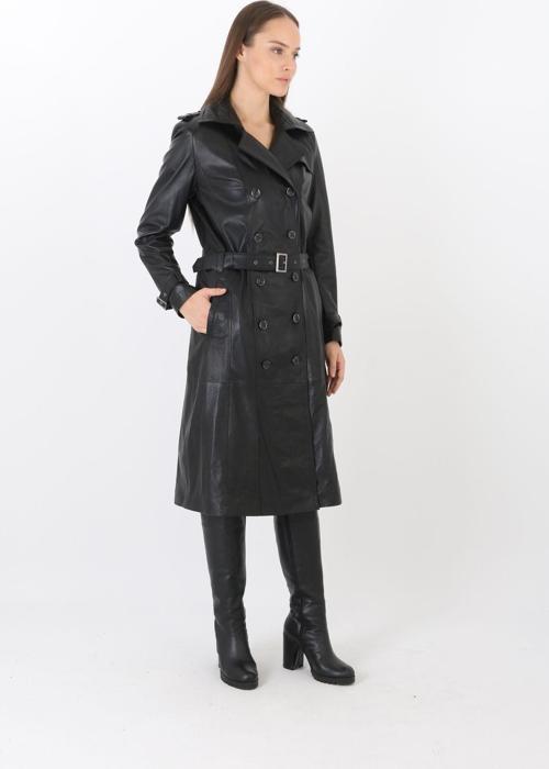 Zarif ve şık tasarımıyla dikkat çeken siyah renkli hakiki deri pardesü, düz deseniyle sade ve modern bir görünüm sunar