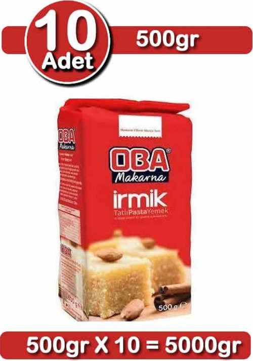 Oba Tatlılık İrmik, her biri 500 g’lık 10 paket halinde toplam 5 kg olarak sunulur. Helvalık iri taneli yapısı sayesinde şekerpare, irmik helvası ve revani gibi tatlılarda kıvamı tutturmak artık çok daha kolay.