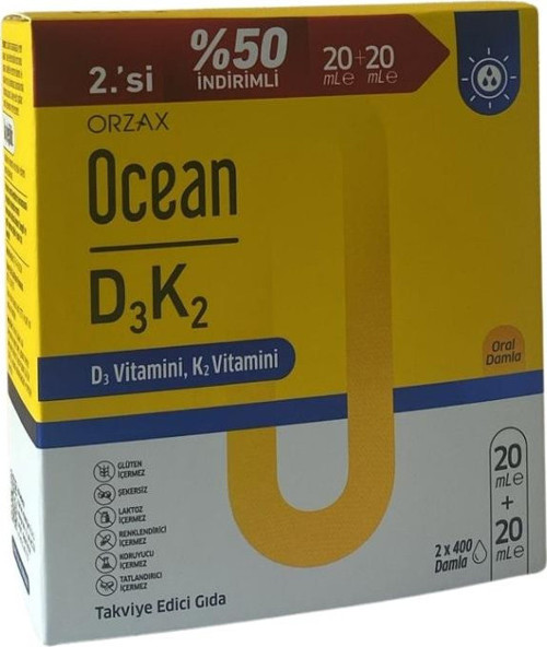 Ocean D3 + K2 Vitamin Damla, günlük D vitamini ve K vitamini ihtiyacını karşılamaya yardımcı olacak şekilde formüle edilmiştir. Damla formuyla pratik kullanım sunar. İçeriğinde koruyucu, tatlandırıcı, renklendirici veya yapay aroma bulunmaz. Taşıyıcı yağ olarak hakiki zeytinyağı kullanılmıştır.