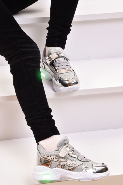 Işıklı tasarımı ile çocukların ilgisini çeken ve onları eğlenceli vakit geçirmeye davet eden gümüş renkli sneaker ayakkabı
