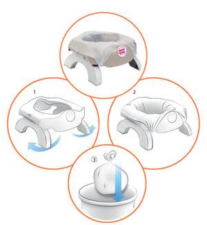 Kullanım: Oturak ayaklarını dışa doğru açın. Poşeti, emici pedler yukarı bakacak şekilde oturağın içine yerleştirin. Kullanımdan sonra poşeti direkt çöpe atın.