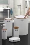 Modern ve şık tasarımıyla banyonuza estetik bir dokunuş katan Mina beyaz ahşap desenli çizgili yuvarlak banyo seti, dayanıklı plastik materyalden üretilmiştir
