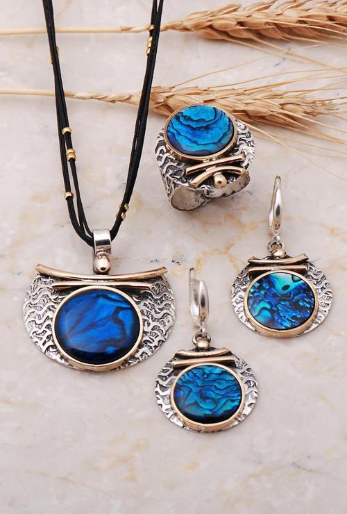 · Ürün küpe, yüzük, kolye ucu ve ipli kolyeden oluşmaktadır. İpli kolye üzerinde yer alan aparatlar metalden üretilmiştir ve yüzeyleri yaldızlıdır.