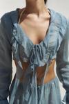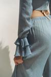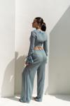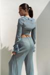 Uzun kollu crop bluz. Kolları volan detaylı ve transparan hafif kumaş. Önü bağlama detaylı.