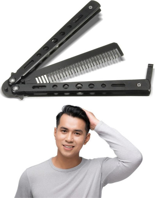 Siyah Katlanabilir Paslanmaz Çelik Kelebek Bıçak Tarak – Sakal & Bıyık Fırçası, Profesyonel Saç Kesimi İçin Tarak