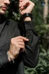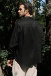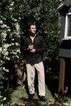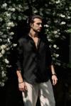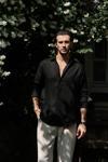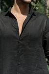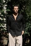 Oversize kesim, klasik yaka keten karışımlı erkek gömlek. Çift düğmeli manşetli uzun kol. Ön düğme kapamalı.