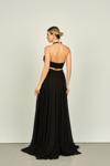Detay: Boyundan örgü bağlamalı ve örgüsü taş detaylı, Derin V yaka, sırt dekolteli, astarlı, uzun abiye elbise;