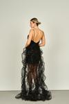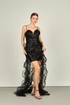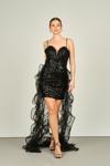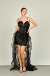 Detay: Derin V yaka, tül kuyruklu (kuyruk sabit), sırt detaylı, mini, astarlı abiye elbise;