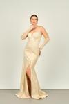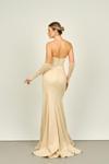 Detay: Sırt dekolteli, balık form, kollar ve etekte otriş detaylı, yırtmaçlı, astarlı, uzun abiye elbise;