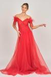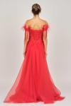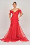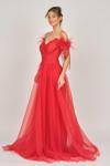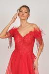 Detay: Düşük omuz, kolları tüy ve boncuk detaylı, uzun, astarlı abiye elbise;