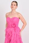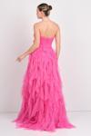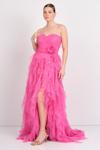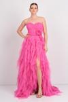 Detay: Straplez kesimi ve kalp yaka detayıyla feminen bir duruş sergileyen, tül kumaştan tasarlanmış maxi abiye elbise; katlı eteği ve yırtmaçlı yapısıyla hem hareketli hem de etkileyici bir siluet sunar. Drapeli gövde yapısı vücut hatlarını zarifçe vurgularken, sabit gül süslemesi modele romantik bir dokunuş katar. Fermuar kapamasıyla pratik kullanım sağlayan bu özel tasarım, mezuniyet, nişan ya da davetlerde göz alıcı bir şıklık arayanlar için ideal bir tercihtir;