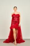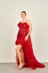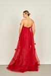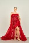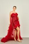 Detay: Sabit tül pelerinli, göğüs ve etekte mini çiçek süslemeli, sırttan sabit tül pelerinli, mini, astarlı abiye elbise;