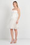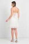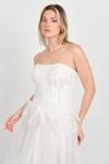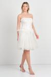 Detay: Straplez kesimiyle zarafeti ön plana çıkaran, üst kısmı tamamen taş işlemeli ve korsajlı yapısıyla vücuda oturan kısa abiye elbise, alt kısmındaki tül detayıyla hafif ve romantik bir siluet sunar. Beldeki fiyonk detayıyla şirin bir dokunuş kazanan bu model, astarlı yapısı ve sırtı çapraz bağlamalı tasarımıyla hem konforlu hem de dikkat çekici bir görünüm sağlar. Mezuniyet, nişan ya da özel davetlerde göz kamaştırmak isteyenler için ideal bir tercihtir;