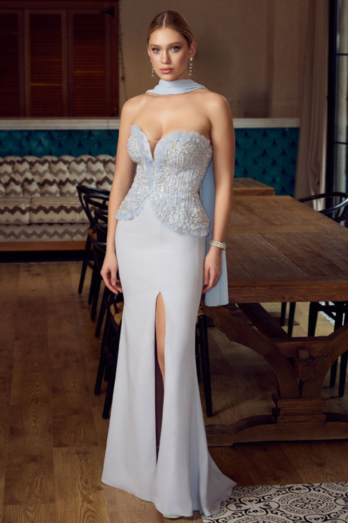 Ömür İnn Ömür Inn Kadın Straplez Taş ve Payet İşlemeli Şal Detaylı Balık Form Abiye Elbise 6790 Buz Mavi