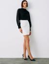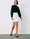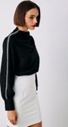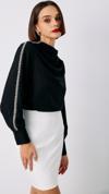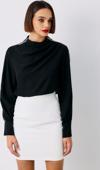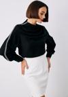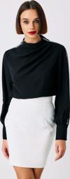 Salaş yaka, arka yaka düğmeli, geniş manşetli uzun kol, kalça boy, omuz aksesuarlı bluz.